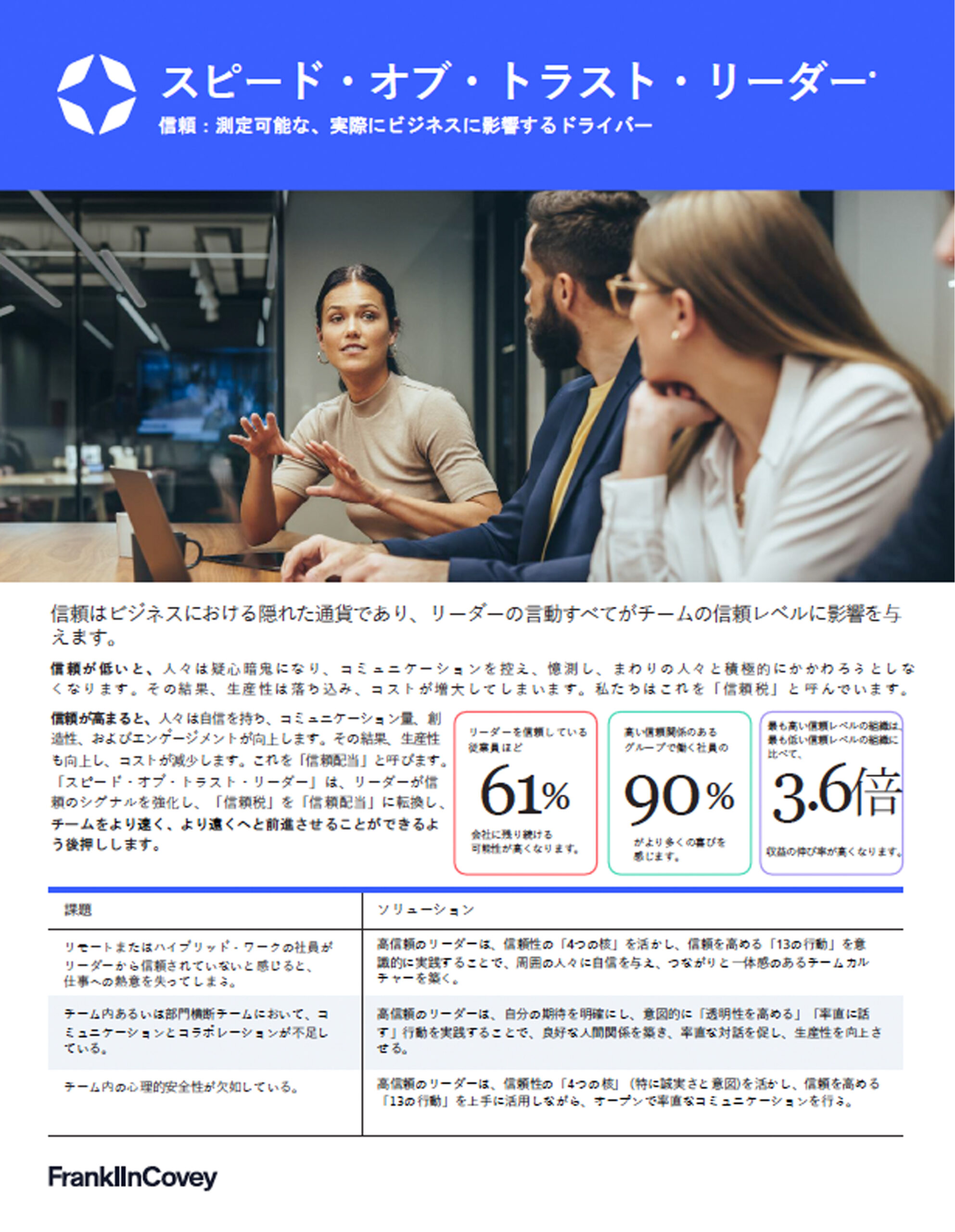 ● リーダーの信頼性を高めたい(リーダーとしての影響力の拡大) ● 重要な利害関係者に対して、信頼を確立・提供・回復したい ● 社員のエンゲージメントを向上させたい ● 信頼されるブランドを構築したい ● 独自の社会貢献をしたい