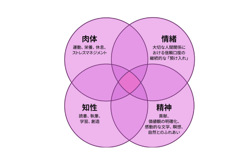 人生で望む結果を得るためには自分自身のエネルギーレベルを高く保ち7つの習慣を実践する必要がある。そのために自分自身を再新再生させる活動を行う。