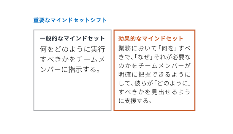効果的なリーダーになるためには、個人が「チームメンバーに何をすべきか、どのようにすべきかを指示する」という考えから、「チームメンバーが『何』の背後にある『なぜ』を明確にし、『どのように』をサポートする」ことにシフトする必要があります。