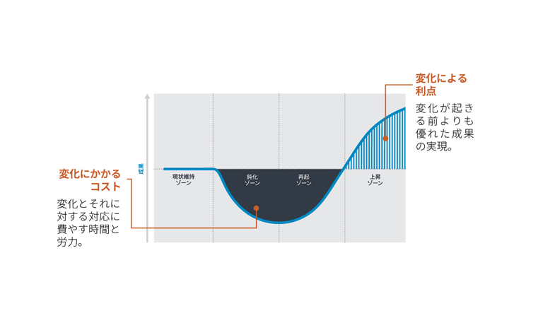この4つのゾーンを意識することで、変化をよりうまく取り入れることができるようになります。また、リーダーは、このモデルを用いて、各チームメンバーがその時点でどのような感情曲線にあるのかを診断することができます。変化に対して、同じように、同じ速度で反応する人は2人といません。しかし、リーダーが「中村さんはゾーン3にいるが、斎藤さんはまだゾーン2にいる」と言えるようになれば、個人単位で問題に対処できるようになります。